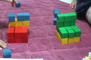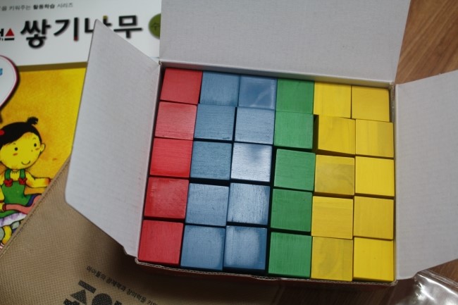 쌓기나무는 정육면체 모양의 나무토막을 쌓아 입체도형을 만들어 관찰하는 활동을 하는 교구로, 조이매스 쌓기나무는 빨강, 노랑, 초록, 파랑 이렇게 4가지 색깔을 사용하여 더욱 다양한 활동을 할 수 있도록 했다고 하네요.