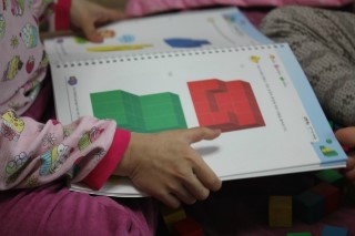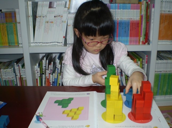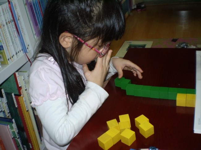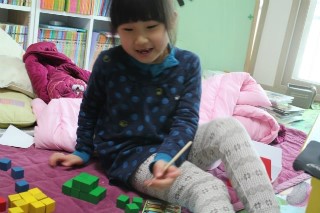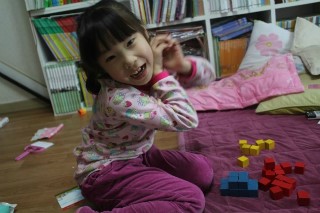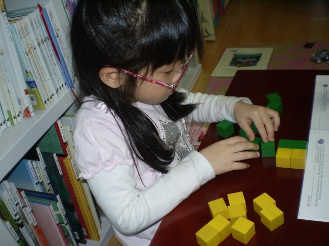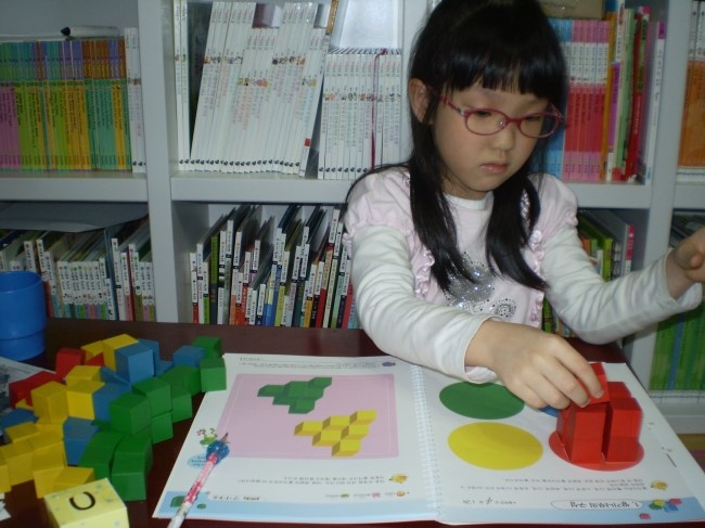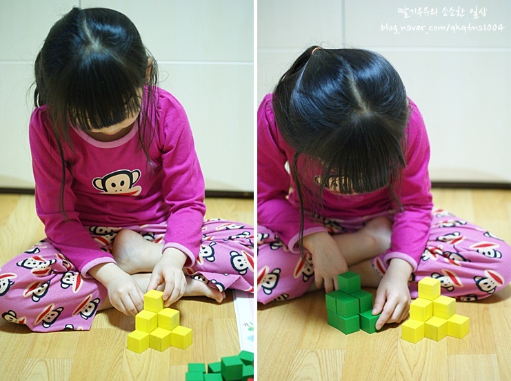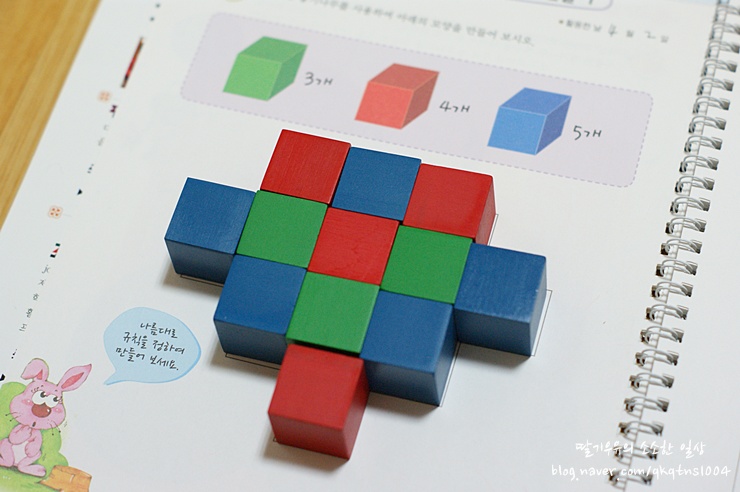 워크북을 넘겨보더니 재미있겠다며 읽어보고 주어진 쌓기나무를 챙겨와서는 평면도형을 만들어 보네요.