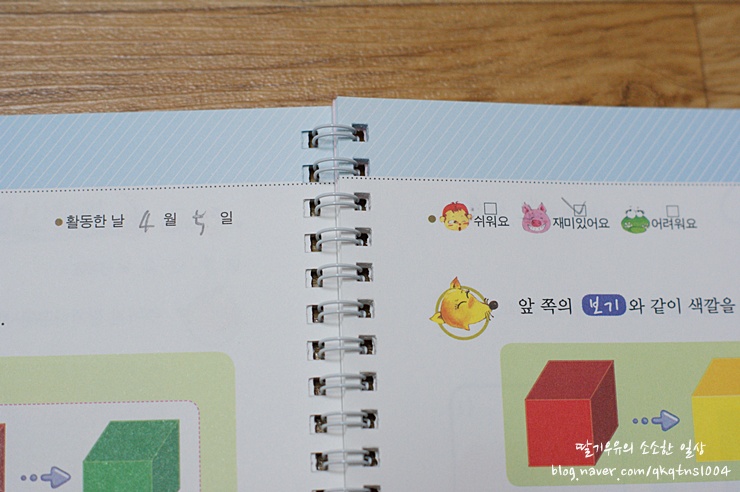 그리고 워크북의 상단에는 활동한 날과 활동 후 평가을 체크해 볼 수 있도록 되어 있어요. 딸기양과 매일 한두 페이지씩 활동하면서 체크하니까 규칙적으로 교구를 활용할 수 있는 거 같아요.