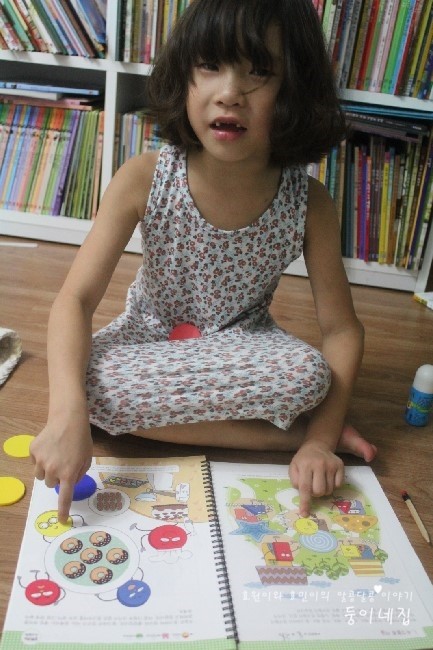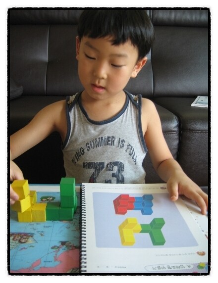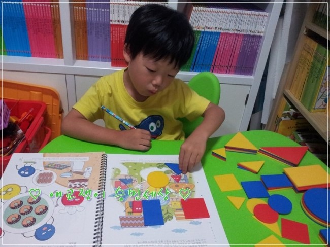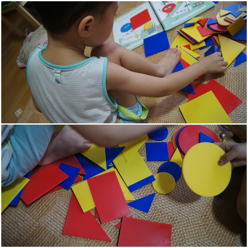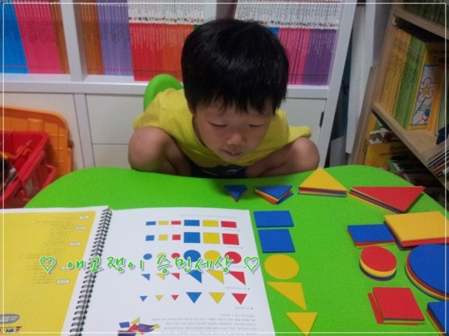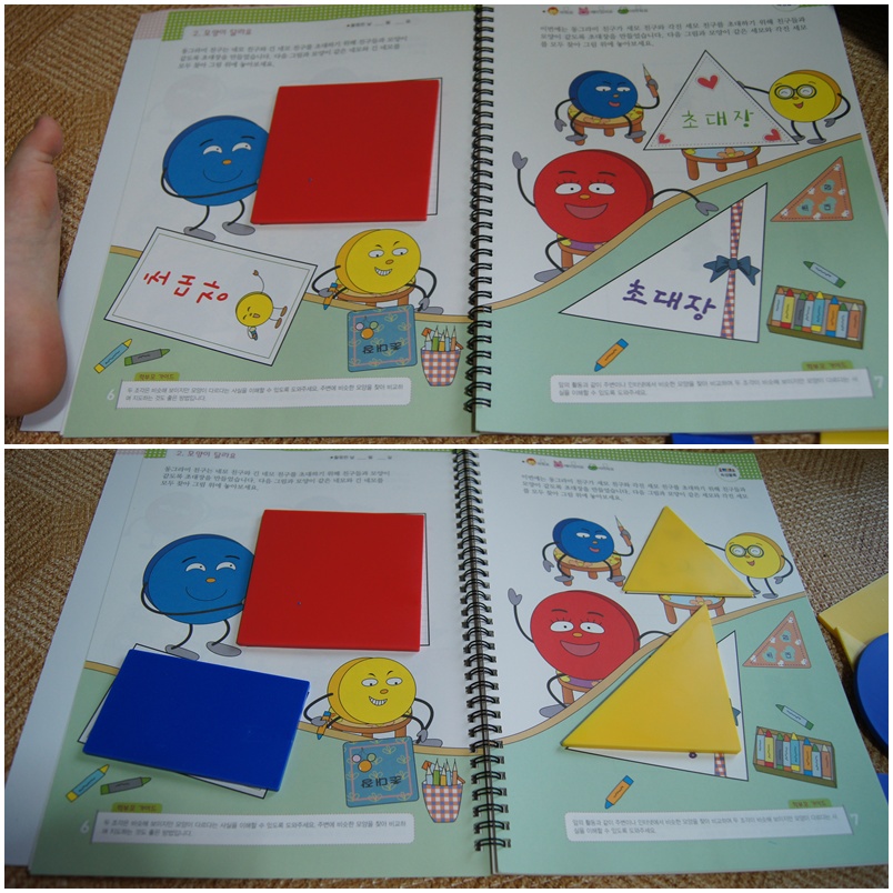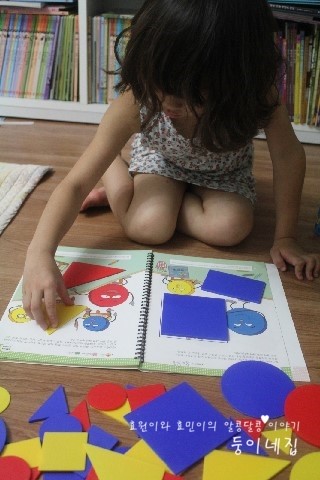 다양한 조각들이 눈에 띕니다. 아이는 워크북을 보자마자.. 펼쳐 도형찾기놀이를 즐깁니다. 학습지에서 도형찾기 놀이를 하면서 작은 교구를 넣어주었는데.. 삼각형, 사각형, 원.. 이렇게 세가지로 분류되던 도형들로 몇가지 카드위에 올려놓아 생일케이크, 자동차등 여러모양을 만들어보는 놀이를 해본 탓인지.. 아주 익숙하게 만져보는 녀석의 모습이.. 참 기분이 좋습니다. 적극적으로 관심있어 하면서 해보고자 합니다. 도형은 플라스틱재질로 매끈하고 색감이 아주 분명하고 뚜렷합니다. 작은아이는 호기심만 보이지만.. 큰 아이는 워크북을 보자마자 펼쳐보며 이것저것 직접 해봅니다. 호기심을 보이는 작은 녀석.. 직접 탐색하고 생각할 시간을 충분히 주는것도 좋습니다^^ 답은 없습니다. 워크북을 활용해서 바로 이것저것 직접 만들어보고 생각해보고 표현해보는 것도 좋지만, 워크북에 기대어 학습적으로 활용하여 공부라는 인식을 갖게 하기보다는.. 스스로 아이가 충분히 가지고 놀고 탐색하고 살펴보면서.. 아이스스로 활용하여 만들어보게 하는 것도 교구에 대한 고정관념이나 거부감을 들게 하지 않는 좋은 방법이기도 합니다..
