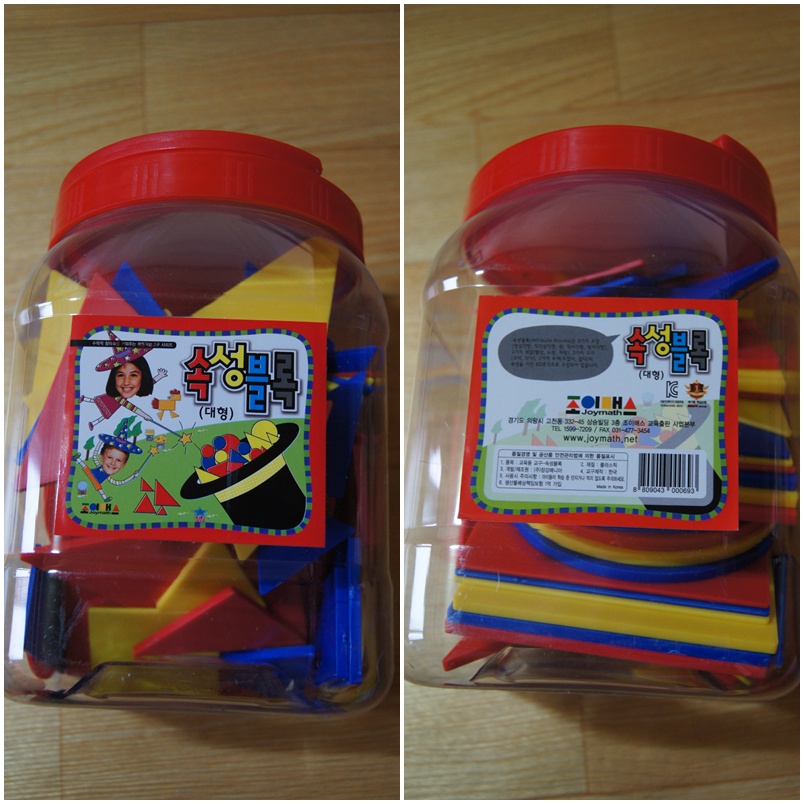 생각보다 더 실~합니다! 각 크기가 대형, 소형으로 구분되며, 색상은 노랑, 빨강, 파랑 세가지 색상으로 구분됩니다. 두께도 두껍고 얇고 두가지 종류로 구분되며, 직삼각형, 정삼각형, 원, 직사각형, 정사각형으로 총 다섯가지로 구분됩니다. 이제껏 도형이란.. 동그라미, 세모, 네모로만 알려준 도형공부를.. 이제는 조금 더 구체적으로.. 네모도 직사각형, 정사가각형 등으로.. 세모도 정삼각형, 정삼각형이 아닌 세모로.. 모양의 차이에 대한 공부를 좀 더 자세히 들어갈 수 있어 좋을것 같더라구요. < 조이매스 속성블럭의 효과 > 도형의 모양을 인식하면서 도형의 특징을 이해하고 도형분류 능력을 키울수 있습니다. 도형속 숨어있는 속성을 분류하면서 논리적으로 사고능력과 분석능력을 키울수 있습니다. 여러 개의 속성을 분류하고 이야기함으로써 표현능력을 길러봅니다. 서로다른 속성을 비교하면서 문제해결 능력을 키울수 있습니다.