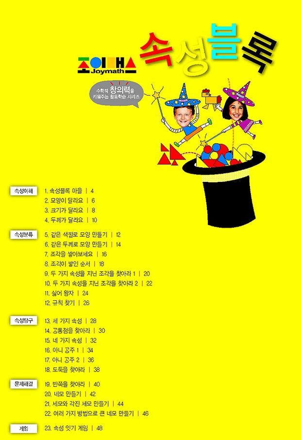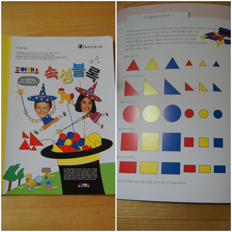 각 도형들을 다양한 방법으로 만나볼 수 있는 워크북.. 쉽지만.. 생각보다 과학적으로 잘 구분되어 있습니다. 속성이해, 속성분류, 속성탐구, 문제해결등.. 쉽지만 체계적으로 공부할 수 있도록 도와줍니다! 공통적인 특성과 서로다른 속성에 대해 살펴보고, 워크북을 통해 다양한 재미있는 도형놀이를 해보면서 도형의 특징을 이해하고 여러가지 속성을 이야기하면서 분석능력과 표현능력을 기를수 있는 조이매스 속성블럭  컬러플한 색상이 돋보이는 워크북.. 정말 재미있습니다.