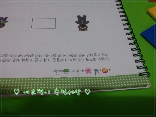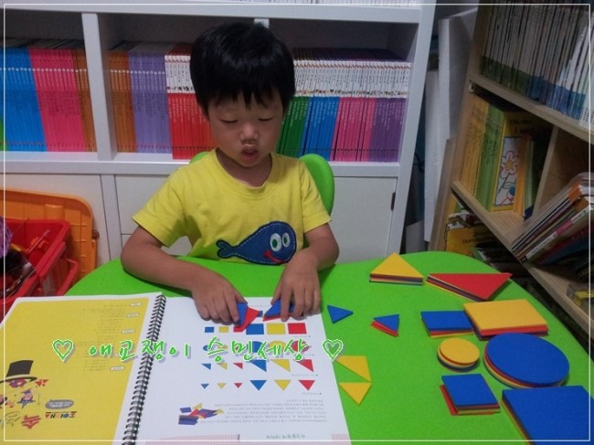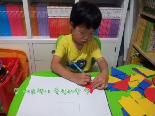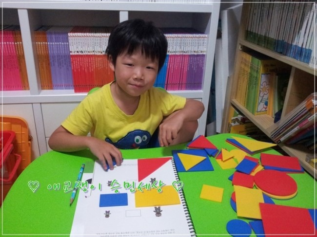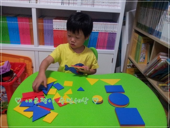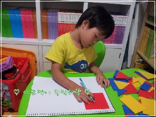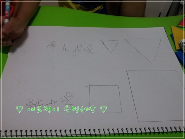 직사각형과 정사각형.. 정삼각형과 직사각형에 대한 인식과 모양차이를 알려주며.. 쉽고 재미있게 차이를 만날수 있습니다. 1분만에 완성한 작품.. 자기가 완성했다고 꼭 사진을 찍어놓으라고 우기는 녀석.. 쉽지만.. 무엇보다 오늘은 직사각형과 정사각형, 직삼각형과 정삼각형이라는 용어에 대해 이야기해보았습니다. 초등 3~4학년때 구분되는 이 부분을 전문적으로 설명해주기보다는.. 그냥 용어 자체만 익숙하게 해주어도 좋을듯 합니다^^ 낼부터는 좀더 재미있고 즐겁고.. 더 상세하게 도형공부를 해보자꾸나!