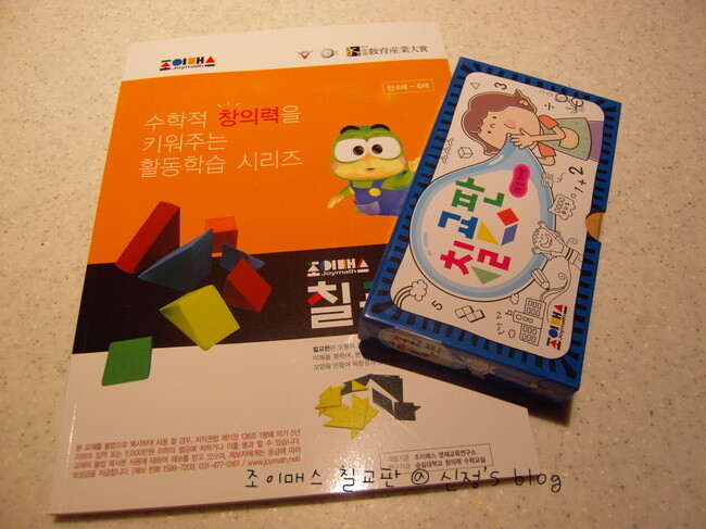 조이매스의 칠교판 수준1 만4세~6세 조이매스의 모든 수학교구에는 수준별로 나뉘어진 교재가 함께 있습니다. 칠교판은 만4세 이상의 수준1 만 7세 이상의 수준2 영재용 이렇게 3가지 단계로 되어 있습니다. 조이매스는 국내 최고의 품질을 자신하고 있답니다. 제가 조이매스를 좋아하는 이유는 조이매스에서는 저렴한 가격에 좋은 품질의 교구를 살 수 있는 것이거든요. 조이매스의 칠교판은 이렇게 파란색, 노란색 2세트가 들어 있기 때문에, 다양한 수학적 활동이 가능하답니다.