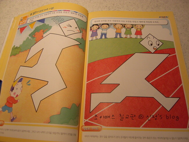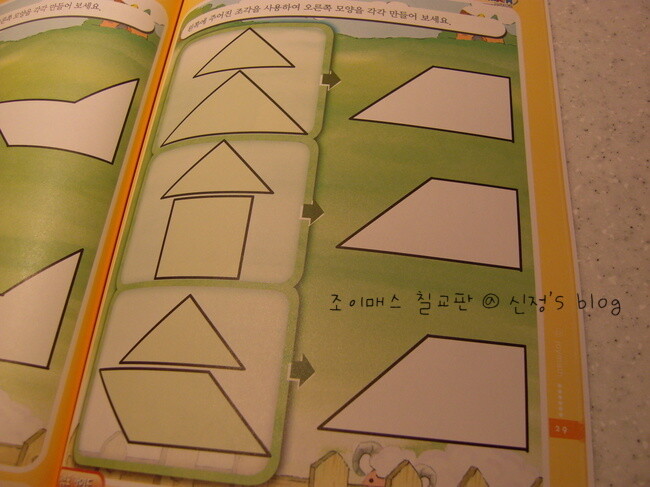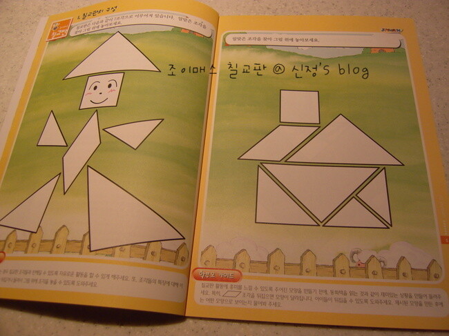 밑그림없이 다른 모양을 만들어 보면서, 창의 교구로 사용해도 좋겠구요... 칠교판이 집에 오자마자, 재밌어 하면서 워크북을 반이나 해냈답니다. 칠교판에 대한 이해가 끝나면, 본격적인 문제 해결 능력을 키워요. 주어진 조각으로 또 다른 도형을 만들어 보는 것도 있고요...