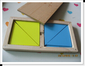 책을 살펴보면, 칠교판의 구성에서부터 여러가지 모양만들기,꾸미기,제시된 조각수의 칠교만으로 모양추측하고 만들기 그림을 보고 크기가 얼마나 다른지등의 활동과 함께 직접적인 학습이 되는 크기가 얼마인지 맞히는 부분까지 활용을 해볼수가 있었어요. 칠교판은 이렇게 7조각의 각기 다른 색상의 2세트가 들어있게 되요.