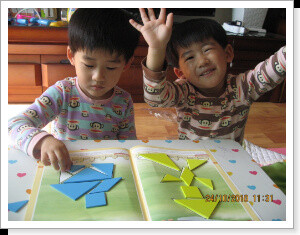 이번엔 언니가 말로 추측한것을 이야기하는데, 직접적인 칠교조각모양을 이야기 하는것이 아니라 칠교조각을 설명하면서 위치에 힌트를 주기도 했어요. 이런 방법은 큰아이에게도 재미난 활동이 되는데요. 큰아이는 칠교조각에 대한 간접적인 설명을 하기위해서 생각을 할 시간도 갖게 되니까요. 작은아이역시 자신이 생각하는 칠교조각의 모양을 다르게 표현하는 언니의 표현방법을 이해하기도 하는 재미난 방법으로 활용을 해볼수가 있었던 칠교판이었어요.