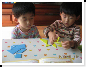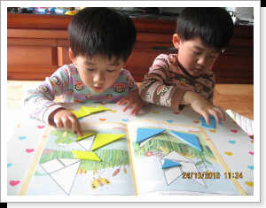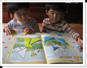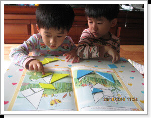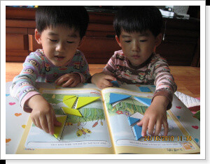 처음 시작은 칠교판의 구성을 알아보기로 했어요. 아주 쉽게 구성들을 알아맞혀볼수가 있었는데요. 유아들의 시기에는 이런 과정이 꼭 필요한것같아요. 우리아이는 조금 커서 단숨에 맞추었지만 유아들에게는 이것들의 하나하나 모양을 관찰하게 되는 자세가 필요하기때문에 집중력도 키워낼수가 있는 부분이구요.