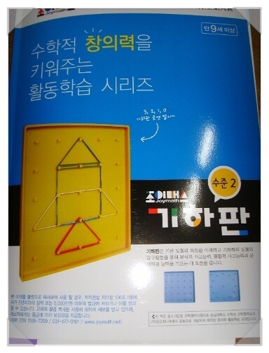 언젠가 우리딸 유치원에 갔다가 조이매스 교구와 같은 모양의 커다란 기하판이 있는걸 보고 얼마나 반가웠는지 몰라요. 우리 아이가 엄마보다 먼저 기하판을 알고 수업에 활용하고 있었구나 하는 생각이 드니 집에서도 할수 있도록 해줘야 겠다는 생각을 했답니다. 그래서 만나게된 기하판... 7세 서연이에게 찾아온 기하판은 수준 2랍니다.  기하판 교구와 워크북이 셋트로 되어 있는 구성이랍니다.