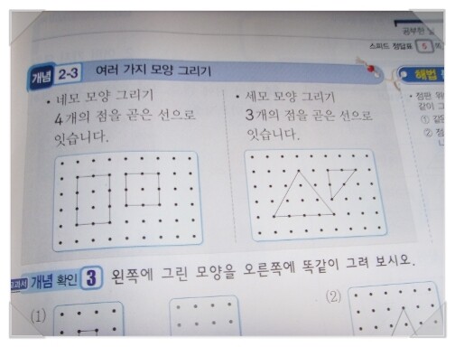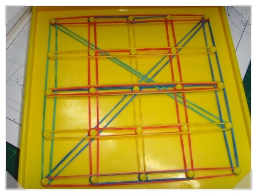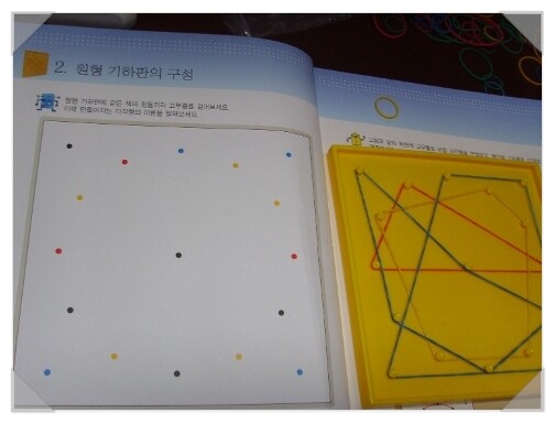 주어진 문제는 빨간색 고무줄에 닿아 있는 침은 몇 개입니까? 초록색, 노란색, 기하판 전체에 있는 침의 갯수는? 기하판에 몇개의 침이 있고 어떻게 활용이 되는 것인지 충분히 알았지요. 참고사항으로 "정사각형 판에 일정한 간격으로 침이 배열되어 있는 것을 기하판 또는 점판이라고 합니다."  교재 문제 - 같은 색의 침들을 고무줄로 연결하세요..  같은 색끼리 연결한 완성된 모습이에요. 여기에 연관된 질문이 빨간색 침들을 연결할때 만들어지는 다각형의 이름은 무엇인가요? 파란색, 노란색이 만드는 다각형 이름은? 삼각형, 사각형, 오각형을 직접 만들었어요. 침 3개, 4개, 5개로 만들어진다는것도 알게 되네요.