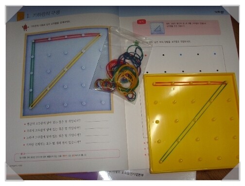 조이매스 기하판 수준2 조이매스의 활동학습 시리즈중 기하판이 무척이나 궁금했던건 초등학교 1학년인 저희집 아이의 교과서에의 여러가지 모양에 관한 내용이 있어서였어요