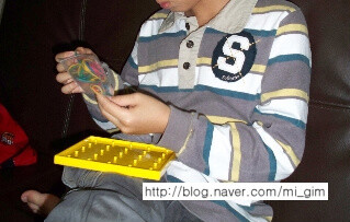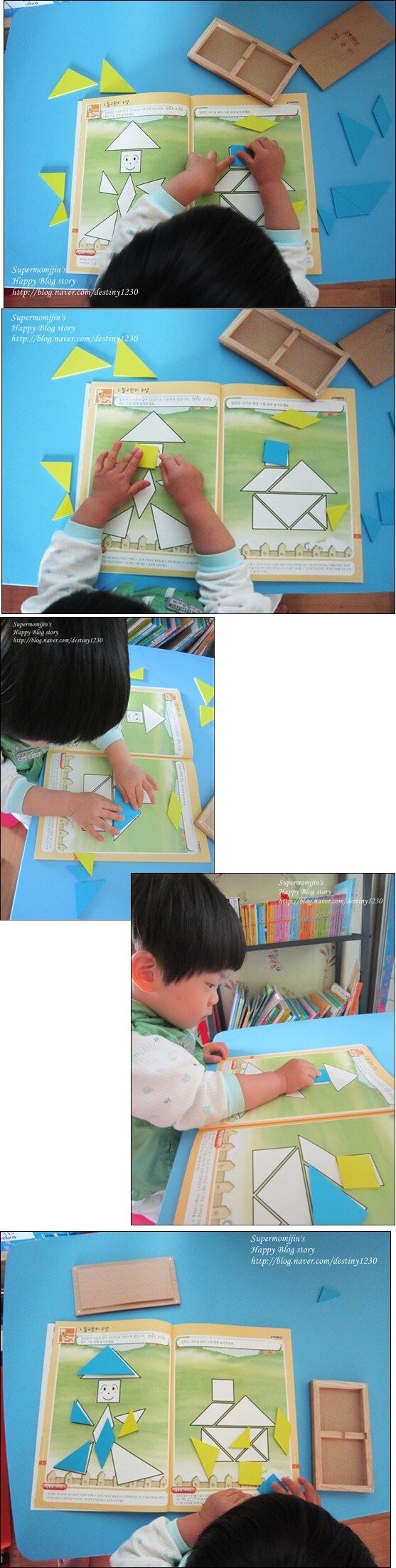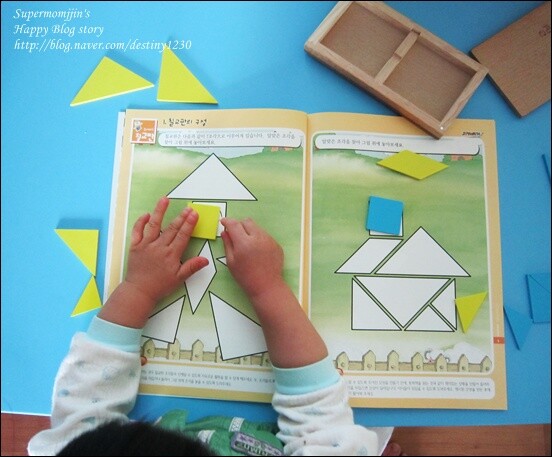 칠교판을 보고는 엄마~나 이거 할래~ 하더니 집중해서 하나하나 놓아보네요. 민준군 하는 걸 지켜만 봤는데 앞부분은 혼자서도 잘 하더라구요. 저는 옆에서 지켜보다 틀린부분이 있으면 힌트를 주는 정도의 역할만 했답니다. 잘한다 잘한다~잘 맞추네~계속 칭찬을 해주니 자신감이 붙는지 재미있어 하면서 계속 하겠다고 하더라구요.*^^*