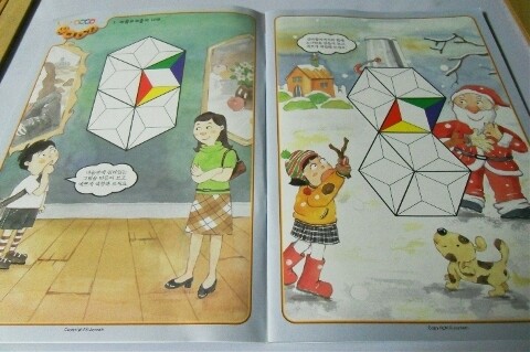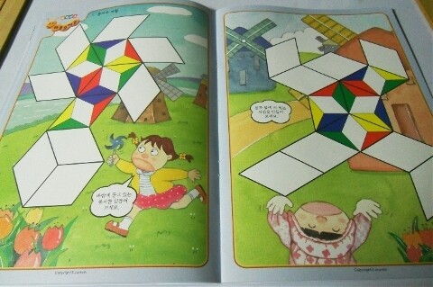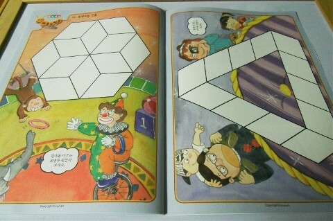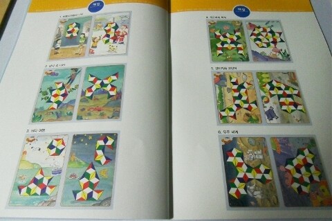 워크북 앞쪽에는 2개의 모양큐브를 가지고 도형을 만들어보는 간단한 문제들이 실려있는데