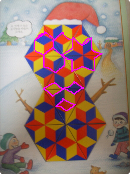 이렇게 정삼각형 퍼즐을 마주맞추니 무슨 모양이 되었을까요? 바로 "마름모"모양이 되었답니다.