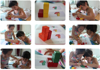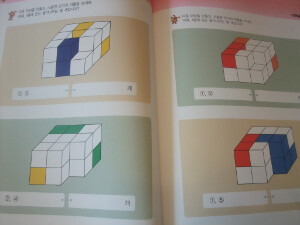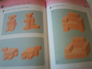 그냥 교재속의 모양만 보면 힘들지만 직접 아이들과 함께 모양을 만들어보고 1층에 있는 쌓기나무의 갯수도 세어보면서 입체도형의 경우 안보이는 도형의 모습까지 상상해 낼수있는 능력을 길러주네요.^^