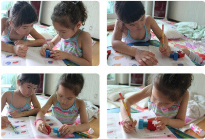 이때까지 주어진 조각으로 완성된 모양을 보면서 모양을 만들어 쉬웠는데, 이번엔 효원이와 효민이가 조금 어려워했어요.