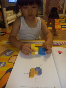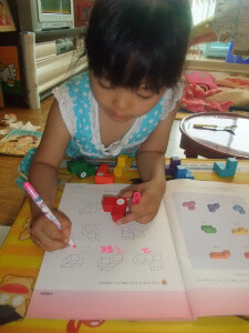 교구를 가지고 놀아보았으니, 이제 교재와 함께 공부해보자구~~~ 우선 소마큐브에 스티커를 붙이고, 이름을 익힌 뒤에 조각들로 모양을 만들어보았어요. 처음이라 어렵지 않았나봐요. 첫 시간은 욕심내지 않고, 조금만 나가기로 했어요.