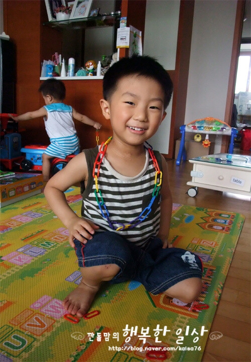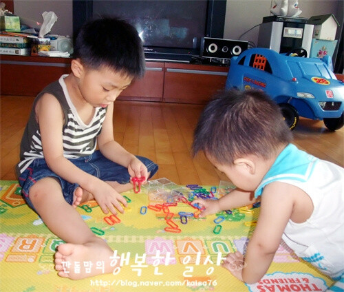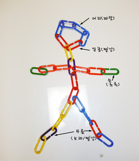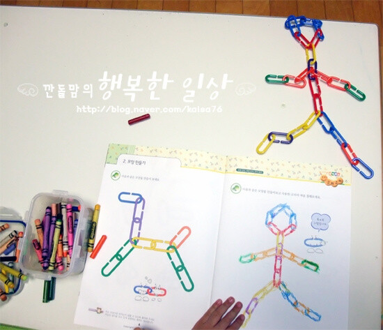 사람만들기는 말모양 만들기와는 달리 색지정이 되어 있지 않아 아이스스로 원하는 색을 가지고 만드는데 아이가 마치 그림그리듯 만드는 걸 보고는 무척 놀랐습니다. 엄마의 짧은 소견으로는 정말 머리, 팔, 다리, 몸통을 각각 분리하여 대칭이 되는 색배합으로 만들거나, 아니면 마구잡이로 색깔을 섞어 만들거나 둘 중 하나로 만들거라고 생각했었거든요. 울 깐돌군이 어떻게 만들었나 궁금하신가요?? ㅎㅎ