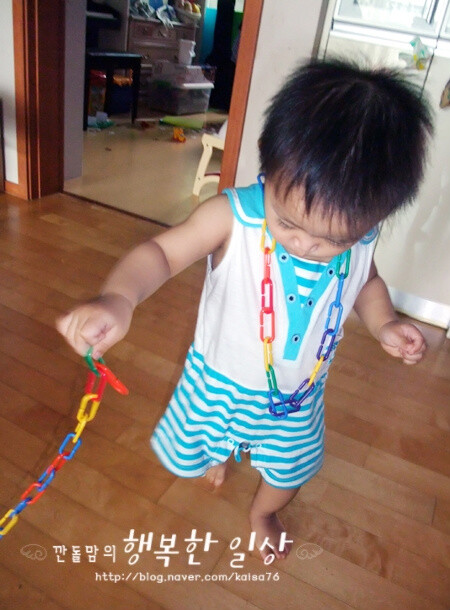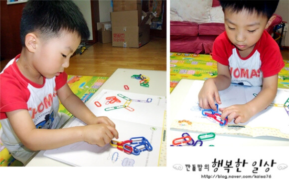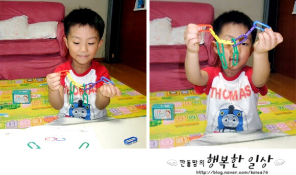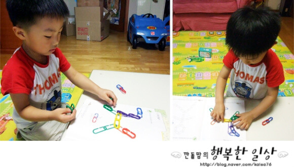 엄마가 '말'이라니 당연히 말이라 생각하고 열심히 만들어 주시는 깐돌군...ㅋ (잇힝~ 엄마가 먼저 깨방정을 떨지 않았더라면 이 그림은 깐돌군에게 얼룩말이나 개 일수도 있었는데 말이에요...ㅠ ㅠ 엄마의 한마디가 아이의 상상의 한계를 정해버린듯하여 못내 아쉽네요. ㅠ ㅠ) 처음에는 말 모양을 따라 하나하나 고리고리를 늘어놓더니 순서대로 책을 보며 연결합니다.
