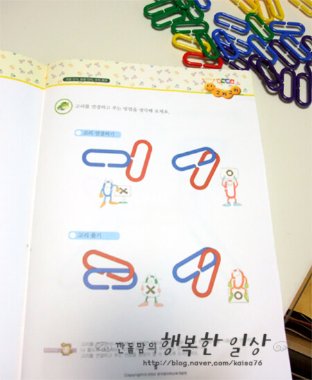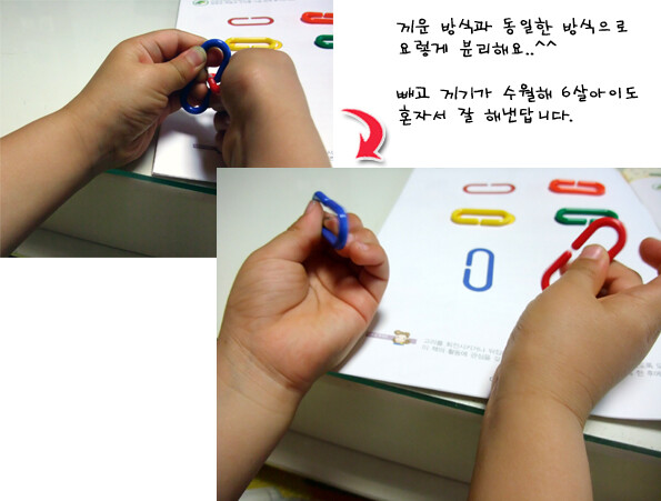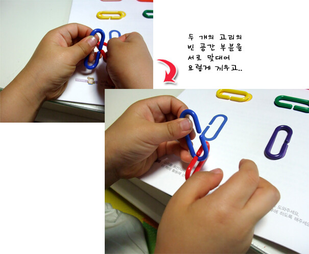먼저 첫 페이지를 펼치면 고리고리를 어떻게 연결하고 또 어떻게 분리시키는지의 방법이 아이도 보고 쉽게 따라할 수 있도록 그림으로 설명해 두었어요.