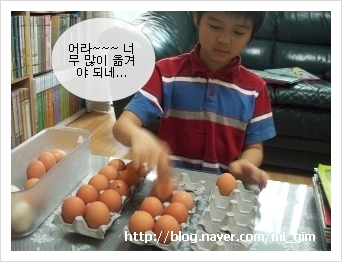 계란판을 가지고 낱개를 10을 먼저 만들어야 한다는 걸 놓쳤던 아이가