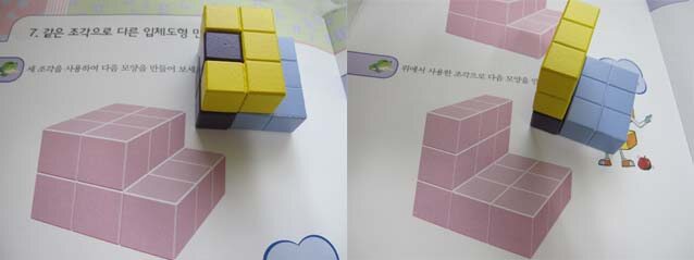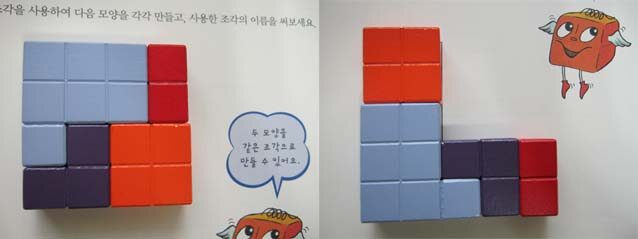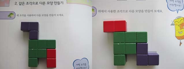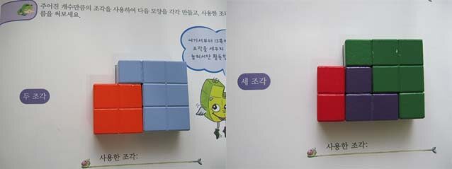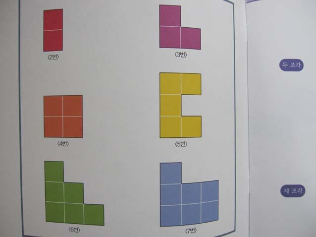 같은 조각을 사용하여 두가지 모양을 만들어 보는 문제인데 첫번째모양을 만들었는데, 2번,3번7번을 사용해서 두번째 모양이 안 만들어지더라구요 이런 경우가 생길거라고는 전혀 생각을 못했다가, 딸아이 몰래 살짝 정답을 보았답니다 이런경우도 있네요 ㅋㅋ