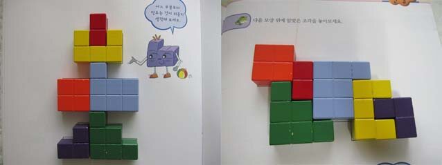 평면적 모양을 만들고 놀아 보았다면 이젠 입체적 모양을 해볼 차례입니다. 이런 입체 놀이는 익숙하지 않아 처음에는 힘들어 했지만, 조각에 따라 방향을 바꿔 세우면 다양한 모양이 나온다는 것을 보여주니 고개를 끄떡이며 이 정도는 해내더군요. 그리고 같은 조각을 사용했지만 다른 입체가 나오는 것에 신기해 합니다.