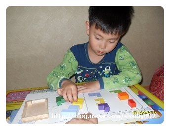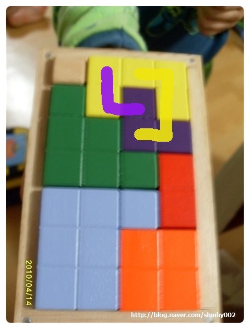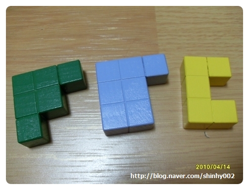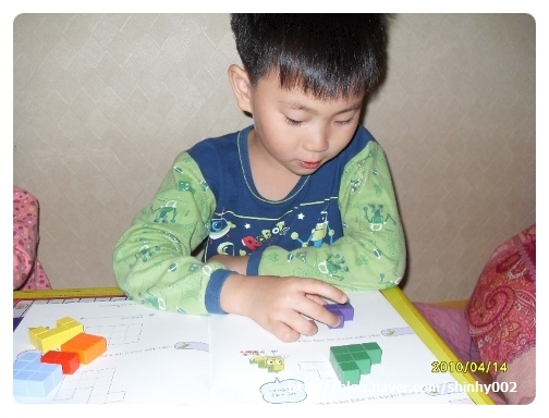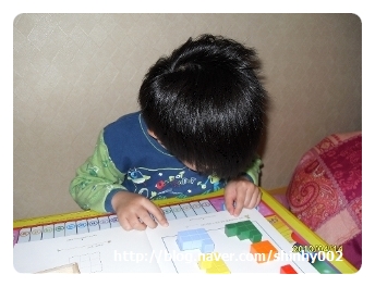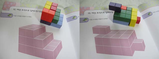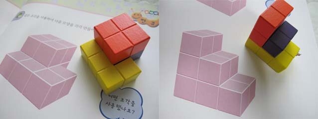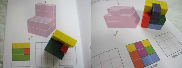 하지만 역시 조각의 수가 늘어나니 힘들어합니다. -.-;; 그나마 다행인것은 위, 앞, 옆에서 본 모양 중 하나를 힌트로 주니 조금 수월하긴 하더군요. 사실 저도 그냥하라면 참 막막할 듯 싶은데, 만 7세인 아이에게는 무리가 있겠지요?