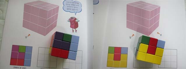 입체도형을 만들어서 위,앞,옆에서 본 모양을 그리고 색칠을 해보는 문제입니다 아이들이 좋아하는 색칠도 하면서 입체모양을 통해서 공간지각력을 키울수 있네요