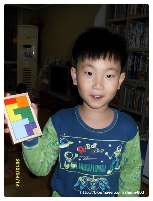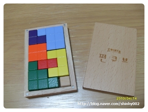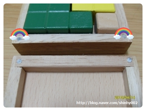 사실 처음에 교구가 생각했던것보다 너무 작아서 살짝 실망하긴 했지만, 아이들이 이리저리 돌려가며 맞춰보기에 큰 무리는 없습니다. 겉상자를 빼내면 나무상자에 화려한 색상으로 예쁘게 담겨 있어 아이들이 좋아하더군요. 처음에 받자마자 작은아이가 쏟아서 갖고놀았는데, 형꺼라고 빼앗아서 담으려다 고생좀 했다지요.ㅎㅎ 이리저리 돌려가며 자리찾아 정리하는 것도 처음에는 일이더라구요. 지금은 익숙해져서 한번에 척~~ 담지만...
