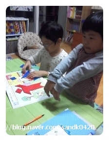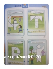 그 와중에 이렇게 울둥이 나이에 맞는 워크북과 칠교판이라고 그래서 울둥이랑 한번 활동을 해 보았어요. 칠교판이 보통 한개 들어 있는데... 조이매스 칠교판은 나란히 2개가 저리 들어있답니다... 울둥이처럼 둥이나 형제가 있는 아이들은 다투지않고 사이좋게 놀이를 해 볼수가 있겠져... 그리고...칠교판이 2개인 이유는 조금있으면 아신답니다..  보통의 다른 칠교놀이처럼 사물을 만들어 보는 활동인...과일 만들어보기~~^^ 여기만 첫페이지라서 모양이 그려져 있답니다...ㅎㅎ 모양이 그려진 대로 대응놀이 하듯이 칠교조각을 놓기만 하면 된답니다..  여기는 한글...글자 만들기 랍니다. 여기서부터는 그림만 저리 제시를 해주고 알맞는 조각을 가져다가 글자를 완성을 하면 된답니다.  숫자 만들기 놀이도 하고... 울승현군이 숫자 4를 만들고 있네요...ㅎㅎ