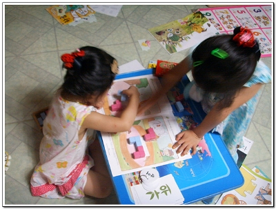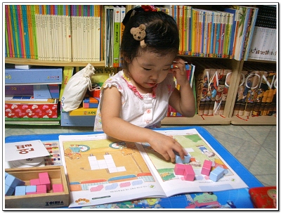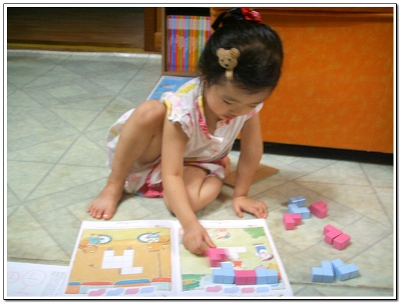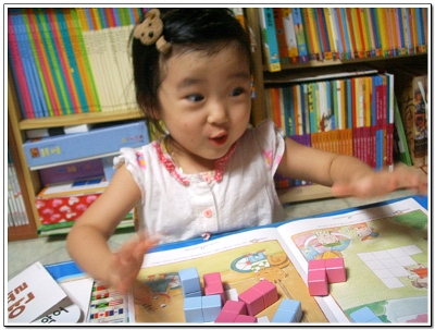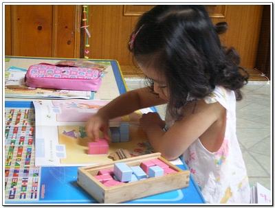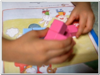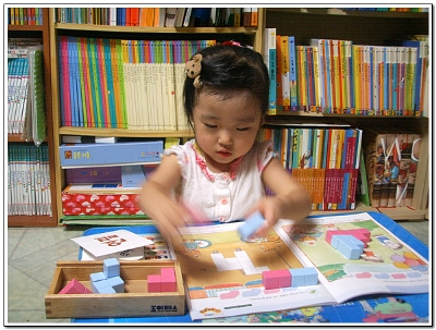 당연 큐브가 공간의 개념이라 아직 5살에게는 어려운가봐요 입체모양의 첫페이지는 그나마 무난히 지나갔지만 뒷장에 여러 입체모양을 만들기에는 아직은 머릿속에 공간이 만들어지지 않아서인지 마니 힘들어해서 옆에서 지켜보는 저두 조금은 힘이 들었답니다 그래서 첫날 꼬마큐브 체험은 여기서 그만 그래두 울 하영이 어찌나 혼자서 교재를 보며 거기에 나와있는데로 잘 만드는지 신기했다니까요 아마 그만큼 큰 거겠죠^^* 다음번 꼬마큐브랑 만날때는 조금 더 쉽게 더 빠른 속도로 모양을 만들 것 같아요 아마 처음 했던 방법을 기억 못하고 다른 방법으로도 모양을 만들겠죠 여러 방법을 이용하여 하나의 모양을 만들어보게 여러번 해봐야겠어요 입체모양은 조금 시간이 걸리겠지만 머릿속에 공간의 개념을 심어주면서 천천히 하려구요 울 하영이 큐브와의 놀이시간에 승민이도 함께 하고파서 슬적 블럭을 가져가는 걸 보니 웃음이 나와서 승민아 너두 조금만 지나면 재미나게 꼬마큐브랑 함께 할 수 있을 꺼야 |