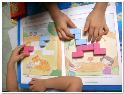 분홍색큐브와 하늘색큐브중에 분홍색을 더 좋아하는 윤성이. 파란색으로 맞쳐 보라해도 코기리 코만 하늘색으로 포인트를 찍어주고 분홍색큐브로 끝까지 맞추더라구요. 그래도 한가지 색만 고집하지 않고 적당히 나누어 사용해주는 센스. 코끼리 아저씨는 코가 손이래 ~~~ 노래까지 불러가면서 재미있게 꼬마큐브를 가지고 놀았어요. ♠두조각으로 이루어진 큐브와 세조각으로 이루어진 큐브를 이용해서 같은 그림이지만 서로다른 조각으로 다양하게 맞추어 보면서 수학적 경험을 할수 있습니다. 여러방법으로 큐브를 활용하면서 아이들 스스로 문제해결 능력도 키워주는데 큰 효과를 볼수 있습니다. ♠워크북외에 아이 스스로 사물을 만들어 보면서 수학학습에 흥미를 유발 시켜주고,