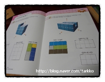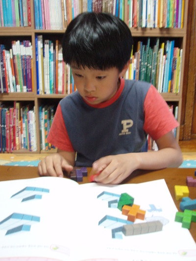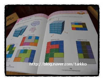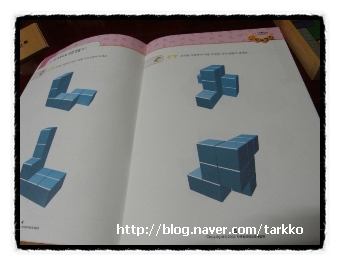 입체 적인 모양을 만들면서 옆에서 본 모습..앞에서 본 모습..위에서 본 모습등을 그려보며 다시 만들어 보지요.. 이 부분은 초등 수학에서 끊임 없이 나오는 쌓기나무 영역 입니다... 제 아이가 지금 2학년인데 1학기에 쌓기나무가 나왔지요.,... 비록 몇개 안되고 단순한 모양이라도 이렇게 교구 활동이 안된 아이들은 사방에서 본 모습 을 그려보는 것을 너무 힘들어 합니다.. 그리고 교재에서는 역으로 사방에서 본 모습을 보고 만들어 보는 것도 제시 되어 있습니다.. 교구를 받은날... 2학년 짜리 아들은 이쁘다를 연발 하며 열심히 만들기에 들어 갔지요.. 일단 충분히 교구만을 가지고 놀아 본뒤에 워크북으로 하나 하나 해보았습니다..