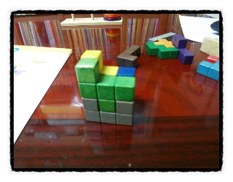 그냥 펜토미노 할 때보다 입체펜토미노가 되니 난이도가 좀 더 있는 것 같아요, 아직 5살 아이에겐 조금 무리네요, 그냥 펜토미노는 곧잘 했는데, 입체가 되니, 아무래도 엄마랑 같이 만들어야 하나 봅니다. 그래도 2조각 3조각은 한 개씩은 만들어 보여 주는 것이. 펀큐브나 소마큐브 갖고 놀았던 것이 영향을 주나 봐요. 교재를 보면 두 조각~여섯 조각, 12조각으로 만들어 보는 활동들을 하게 되어 있어요. 하다 보니 공간지각력과 문제해결 능력이 많이 키워질 것 같아요.   5살 소민이는 두 조각, 세 조각으로 하는 것은 혼자서도 조금씩은 완성할 수가 있어요,. 두 방법 중 한 방법은 혼자서 찾아내는 정도랍니다. 입체적인 교구라서 그냥 혼자서 이것 저것 만들어 보는 것이 현재는 더욱 흥미있는 활동이랍니다. 판에 퍼즐처럼 끼워넣기도 즐거워 하고요, 다 맞춘후에 한 개 남겨 놓고, 동생 소안이보고 퍼즐이라면서 끼워 넣어 보라고 시키기도 하지요. 정리 통을 보면 위치를 나타내는 그림이 있어서 마치 퍼즐과 같은 느낌을 준답니다. 판없이도 퍼즐을 만든 다면서 잘 갖고 놀고 있어요.