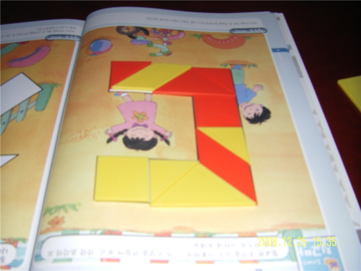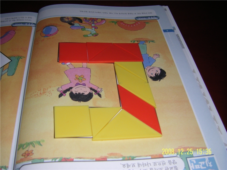 - 도전해봅시다 칠교 조각들을 이용해서 만들어기보기 그리고 뒤편에는 해답이 나옵니다.. 문제해결 코너에서는 처음 몇가지만 둘째가 따라하더니.. 좀 힘들어 하더군요.. 그래서 하고 싶어 하는 부분만 몇번 더 시켜주었답니다.