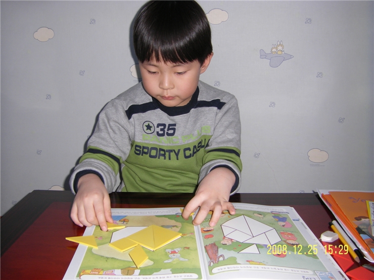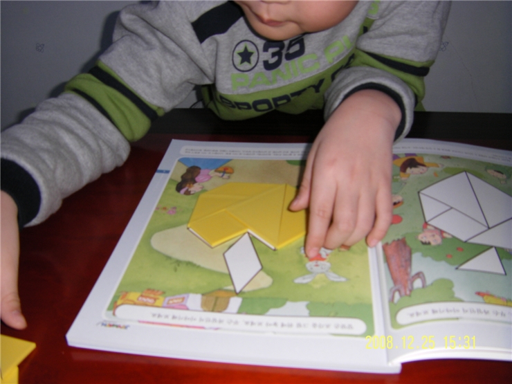다양한 그림속에 하얀 그림여백을 두고 그곳을 채우는것이 아이들의 임무다. 처음에는 칠교조각형태가 그대로 나타나있어서 동일한 도형을 그대로 올려놓기도 해도 되지만, 그 다음에는 나뉘어지지 않은 공간에 나름대로 맞는 조각을 올려놔야한다. 언뜻보기에는 다른 모양인듯한 곳에 같은 조각모음을 가지고 만들고 보면 그 크기가 같다는 것을 배우게도 되고, 몇조각으로 이루어졌는지를 파악하다보면 그 크기를 파악하는데도 도움이 된다.