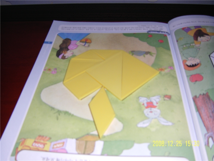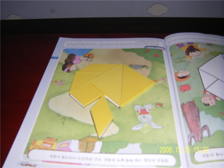 7개의 조각을 다 사용해야 할 만큼 모양의 크기가 커지니 몇 개의 조각을 움직여보더니 “모르겠다”하길래.. 책의 하단에 있는 “학부모 가이드”에 설명처럼 큰 삼각형을 먼저 집어주면서 이것부터 놓아보자 했더니..차츰차츰 맞춰가더군요 그리고 책으로 된 모양책이라 잘 펼쳐지지 않으면 칠교조각을 올려놓기 힘들거 같았는데 이책은 다른 책 제본 보다는 훨씬 잘 펴지게 만들었더군요..^^