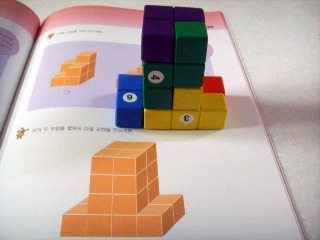 소마큐브를 사달라고 성화인 8살 딸아이때문에 알게된 조이매스의 소마큐브입니다. 받자마자 열공모드로 들어가는 딸아이를 보며 교재가 궁금하여 천천히 훑어보게 되었습니다. 책 표지에 씌여있는 그대로 '수학적 창의력을 키워주는 활동학습 시리즈' 입니다. 수준1은 만 7세 이상 이용하라고 되어 있지만 3살난 아들녀석도 큐브로 침대도 만들고 의자도 만들고 장난감 마냥 잘 가지고 논답니다. 물론 교구 정리까지는 힘들겠지만 이렇게 가지고 노는것도 좋을것 같아요~ 소마큐브는 정육면체를 서로 다른 7개의 조각으로 분해한 것으로 다양한 기하학적 도형을 이해하고,다양한 활동을 통해서 집중력을 키우는데 좋은것 같습니다. 아마 교구만 있었다면 제대로된 활용을 못했을거에요.. 수준1 워크북 덕분에 보다 다양한 활동으로 아이의 창의력을 끄집어 낼수 있었거든요~ 처음부터 했지만 도중에 자기가 하고 싶은것이 있으면 건너뛰어 하기도 했습니다. 각 모양에 맞게 조각의 이름(숫자)이 적힌 스티커를 붙히고 워크북에 있는 도형을 만들어보면서 어떤 모양이 사용되어졌는지 알아보았습니다. 단순한듯 보이는 문제였지만 도형을 맞추고 색칠하는 과정이 아이의 집중력을 요하는것이어서 문제푸는 내내 침묵으로 고요했는데 열심히 하는 모습이 좋더라구요~ 여러 모양들을 보고 따라서 만들어본 다음 위,앞,옆에서 본 모양을 색칠해보는것 또한 초등학교 들어가면 도형편에서 하는 것이어서 많은 도움이 될 듯 싶었습니다. 큰아이가 초등학교 들어가서 처음으로 힘들어했던 문제가 도형 부분이었습니다. 숨어있는 도형 찾기라든지, 앞,뒷,옆에서 본 모양을 그리는것을 조금 어려워했는데 이 소마큐브를 미리 만나보았더라면 그리 어려워하지 않았을텐데..하는 아쉬움이 들었습니다. 뒷부분으로 갈수록 문제가 조금씩 어려워졌지만 차근차근 풀면서 성취감도 느끼고 자기 나름대로 여러 모양들을 만들어보면서 즐겁게 활용하는 모습을 보면서 정말 알찬 교재라는 생각이 들었습니다. 딸아이의 큐브사랑은 끊임이 없어서 여행갈때도 꼭 챙겨가고 친구가 놀러오면 큐브와 함께 가지고 놀면서 급기야는 딸아이 친구 엄마가 하나 사달라고 부탁까지 하셨답니다. 아이들이 큐브를 가지고 활동하는 사진도 함께 올려봅니다. 딸아인 큐브를 원래 모양인 정육면체로 만드는 것을 재미있어했습니다. 다른 방법으로도 맞춰보고 하면서 애쓰는 모습이 대견하기까지 했네요~ 수준1을 마치면 윗단계의 워크북을 사서 꾸준히 해주고 싶네요~ 알찬 교구와 교재로 정말 즐거웠습니다~^^*